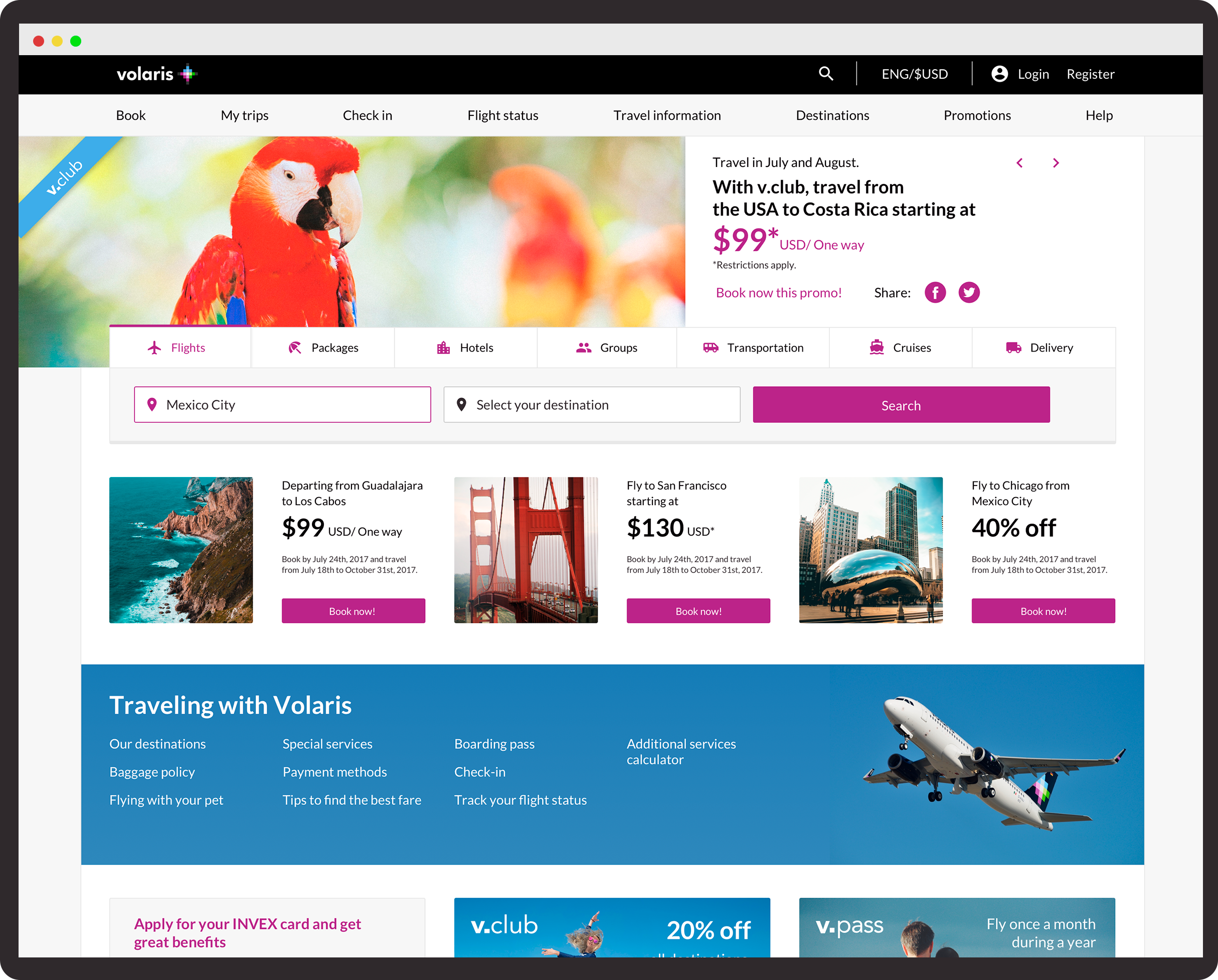 We build the main navigation considering the different touch points travelers goes by: starting by searching and finding the best deals. We provided with plenty of real state to our promotions carousel and search bar as this is the beginning of our customers journey and where impressions are crucial.